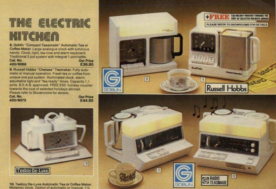 In November 2019 Argos launched a digital archive website called ‘Book of Dreams’ containing all their old catalogues back to 1974. Apparently the site had 1.8 million visits in the first 48 hours. I was really looking forward to rooting through it for teasmades, but sadly the domain address argosbookofdreams.co.uk is no longer active and simply redirects to their main website. However, you can still see lots of old Argos catalogues on Issuu, courtesy of Retromash. They have an index to their online Argos catalogues here.