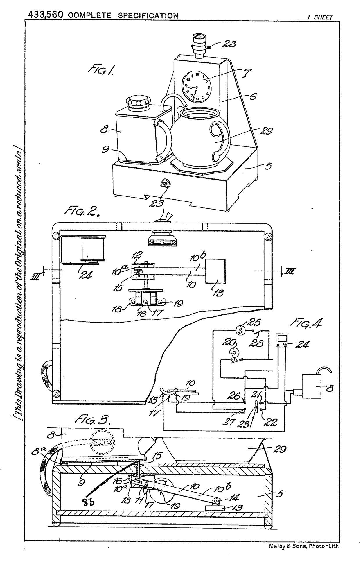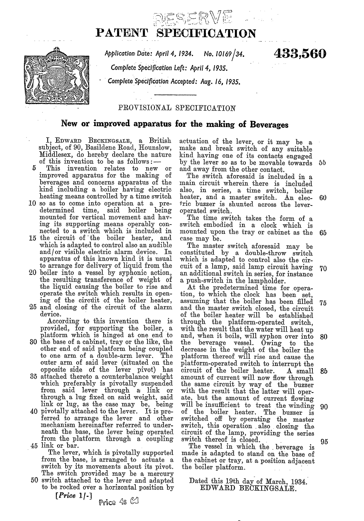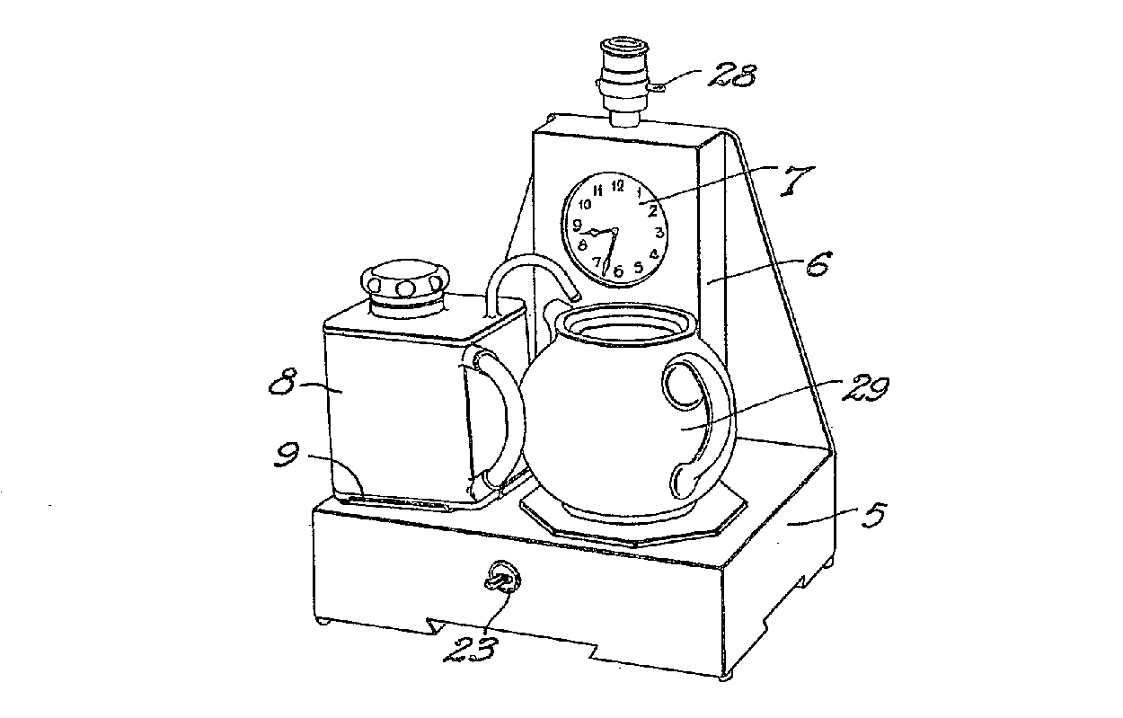 The battle to produce a commercial electric teasmade was extraordinarily heated. The two earliest inventions were Absolom’s patent application of May 2nd 1932, followed by William Hermann Brenner Thornton‘s (taken up by Goblin) on Jan 27th 1933. Edward Beckingsale’s followed with a patent application on 4th April 1934.