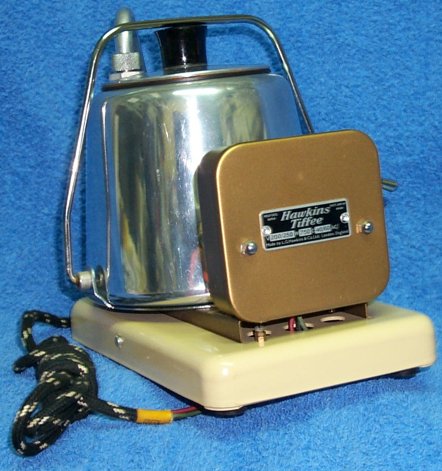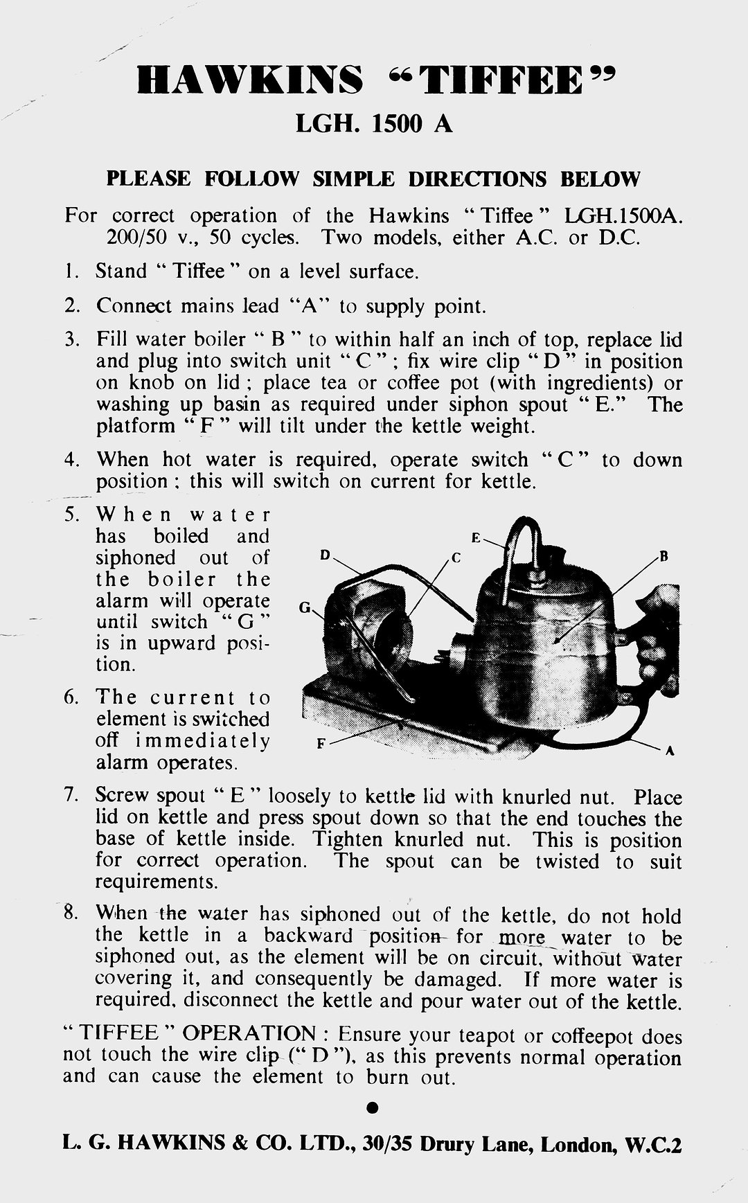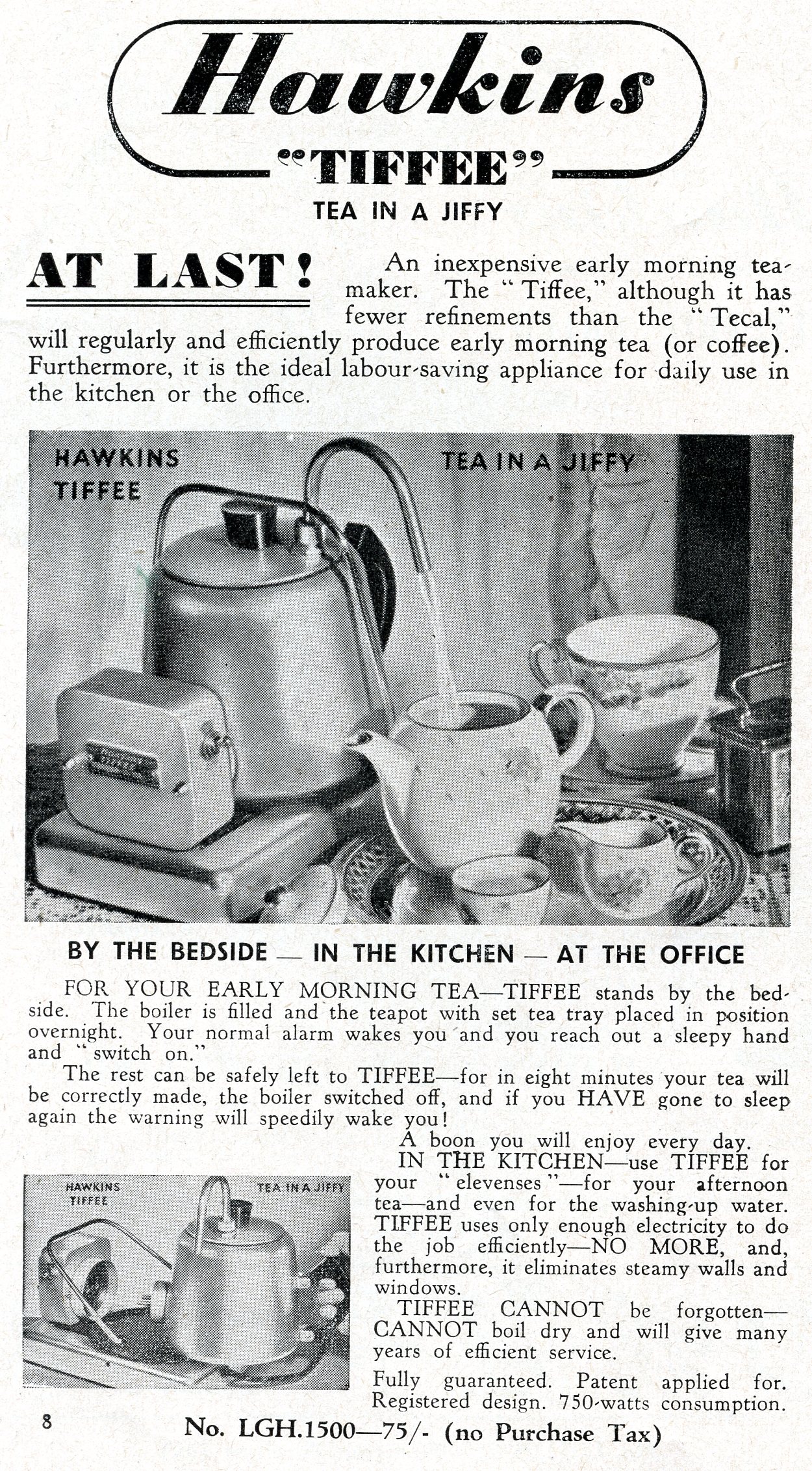 I have a 1954 catalogue which shows the Tiffee, listed as LGH 1500, price £3-19-6 (wholesale). It bears the delightful slogan: “Hawkins Tiffee – Tea in a Jiffy”