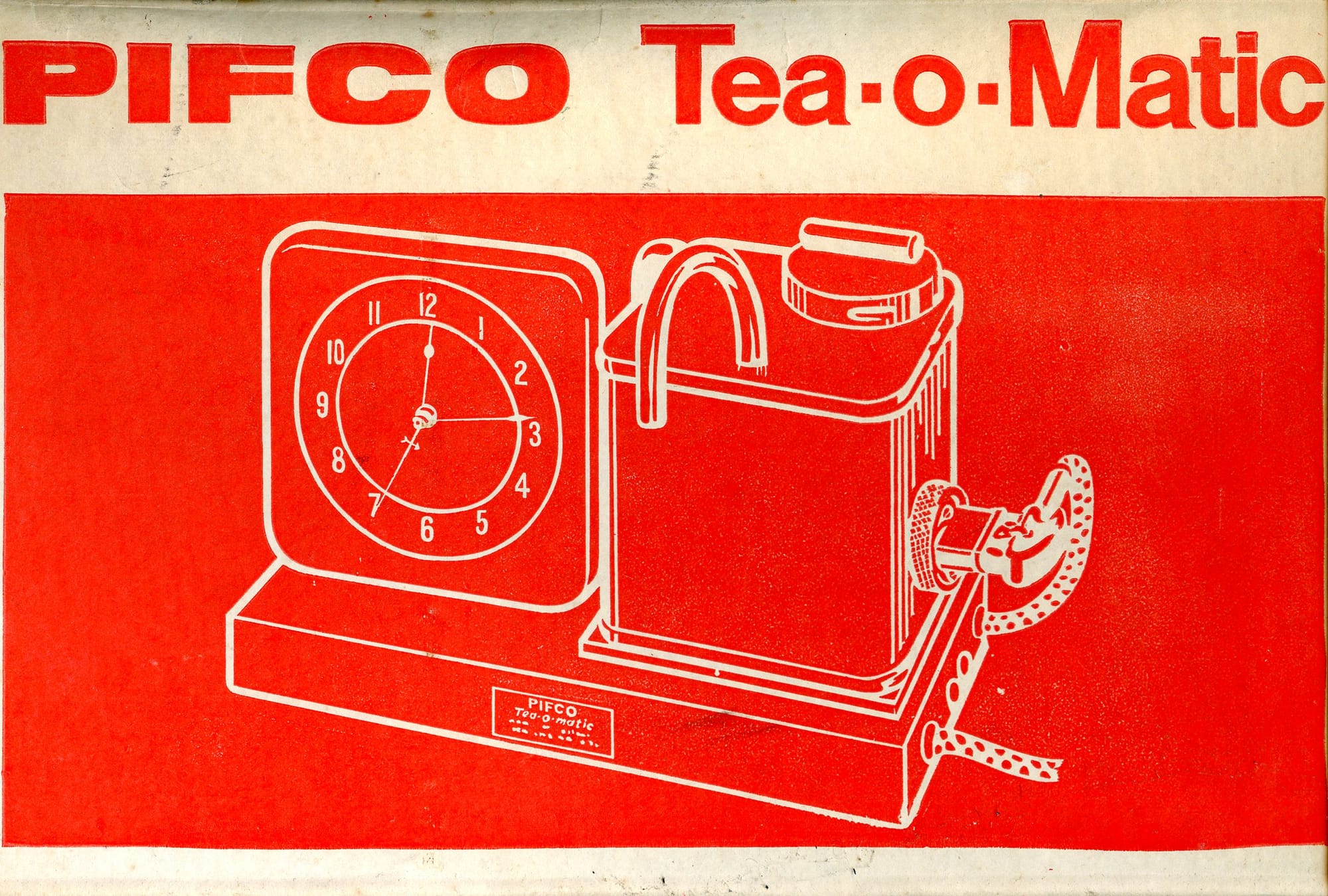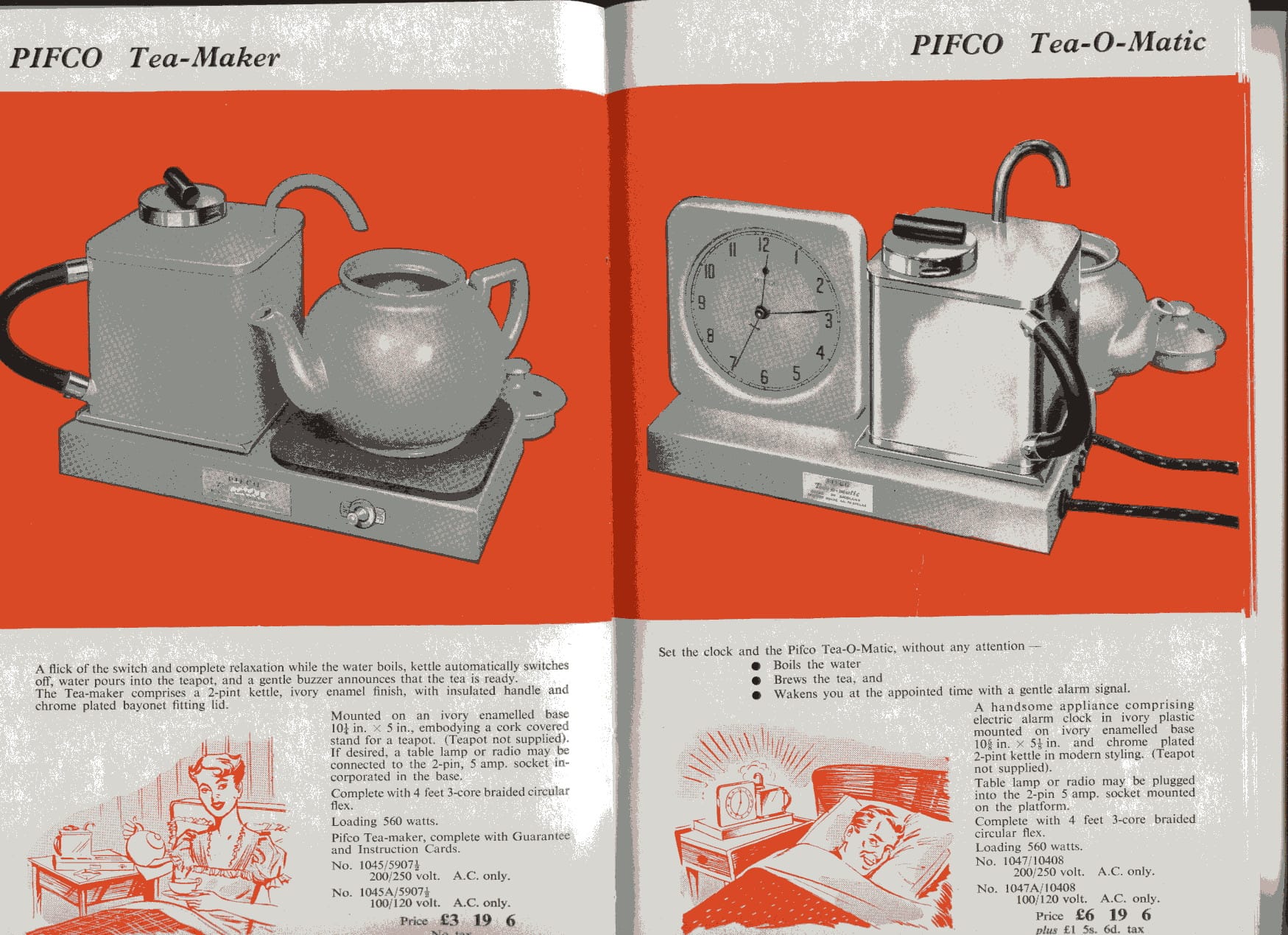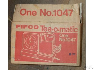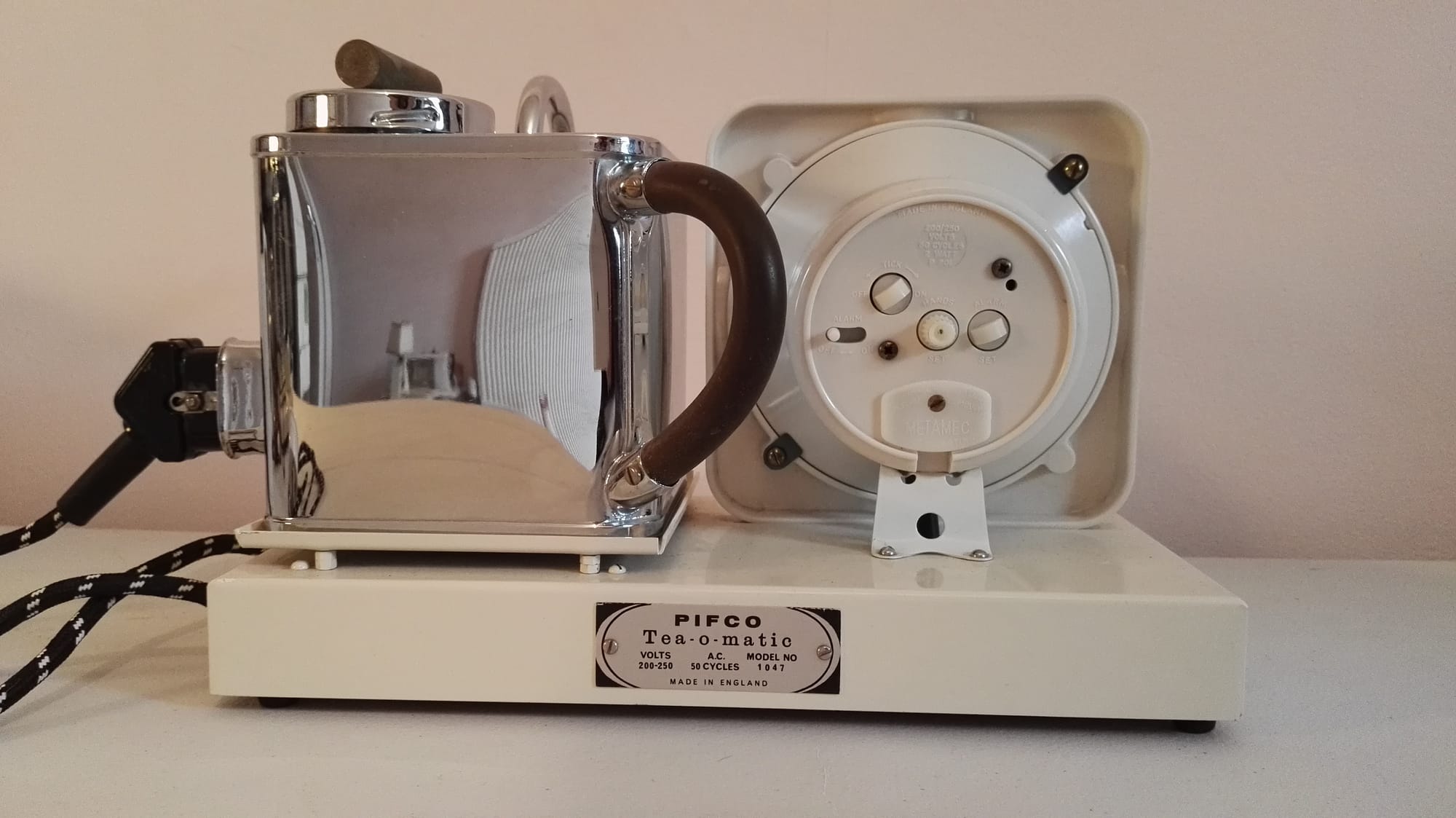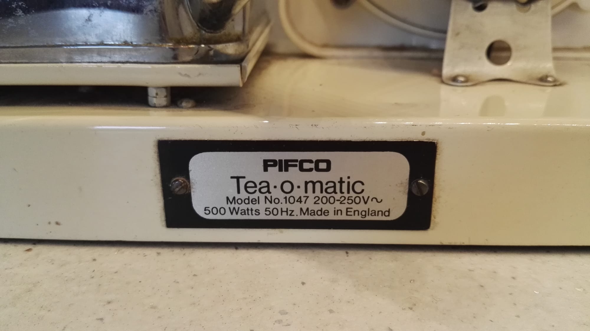In 1954 Teesmade Engineering entered into an agreement with Pifco, to produce their two pre-existing models in the Pifco name. These became the Pifco 1045 and 1047 Tea-o-Matic. Teesmade Engineering not only manufactured the units but also provided after sales care. There is a label on the underside of many units giving the address for spares and service as 52 Lansbury Drive, Hayes, Middlesex, Tel Hayes 0661, and asking customers to ship the kettle only if only that item required repairs.