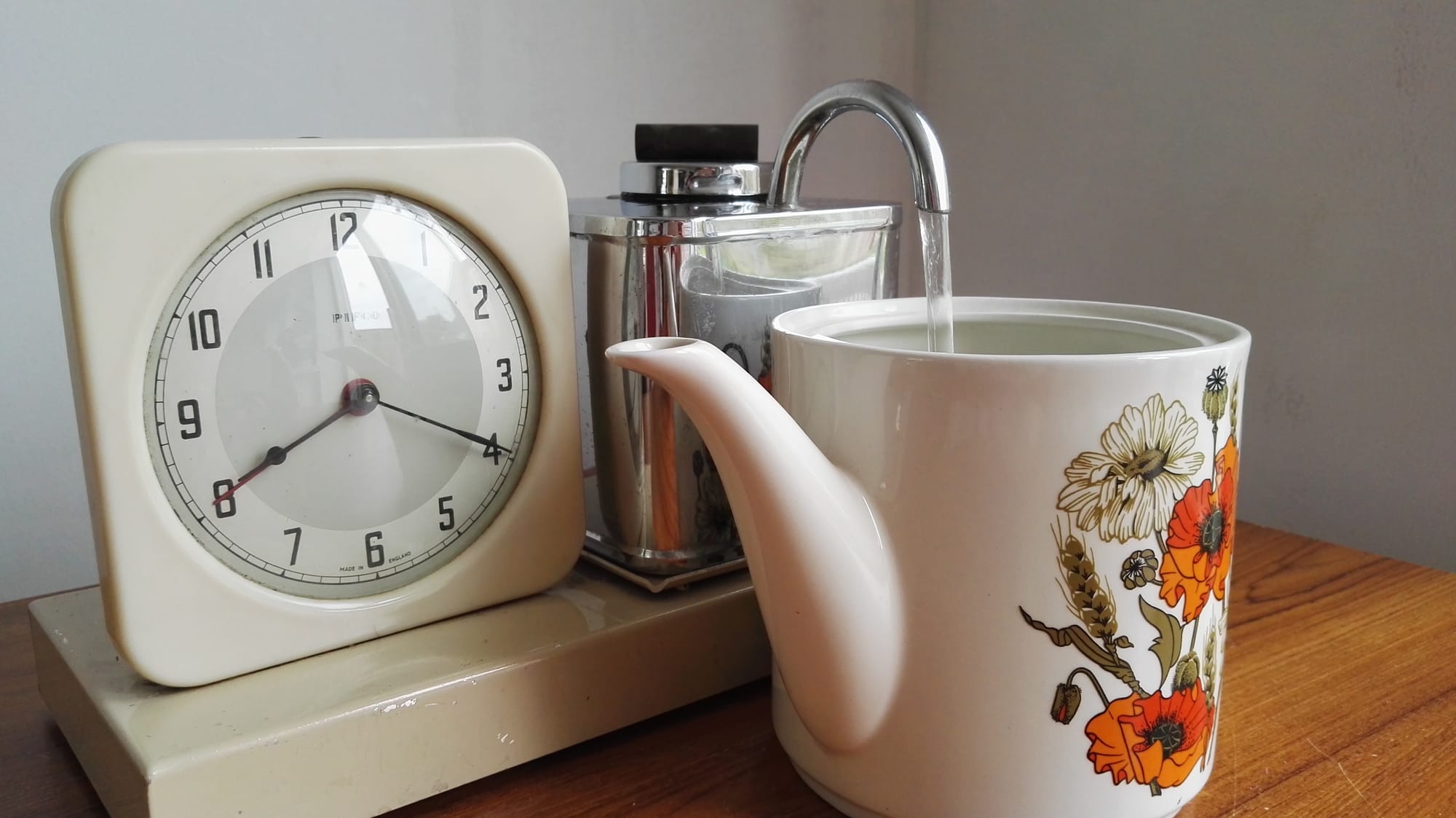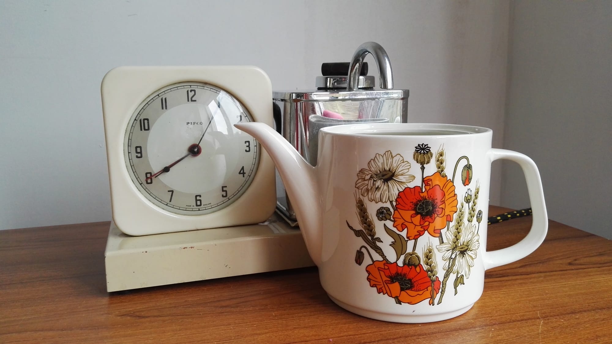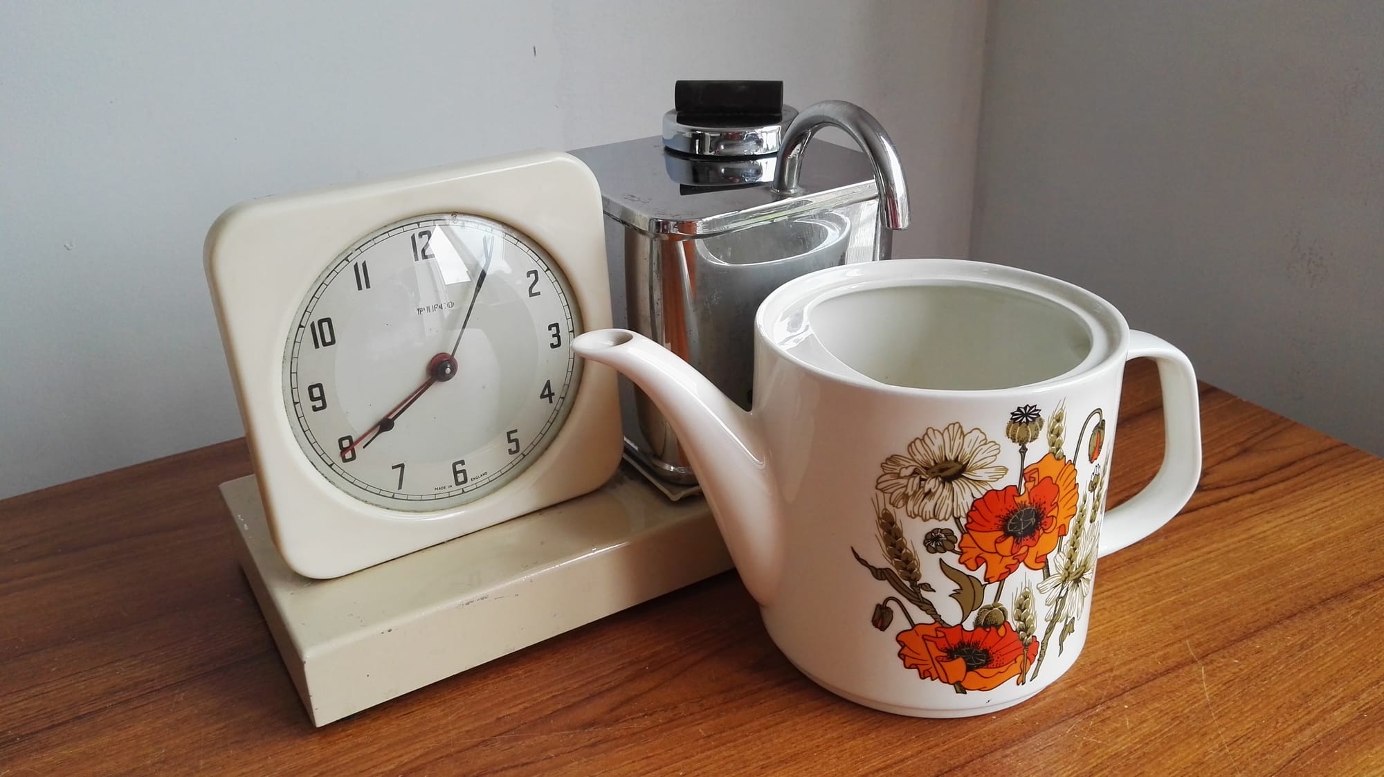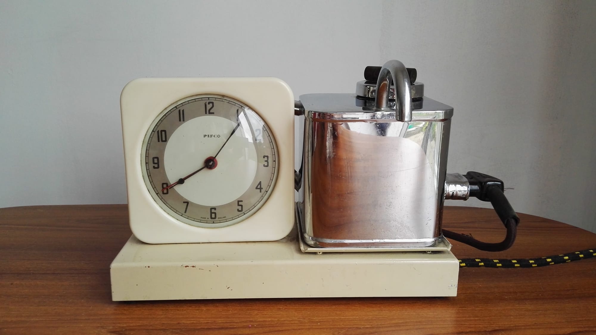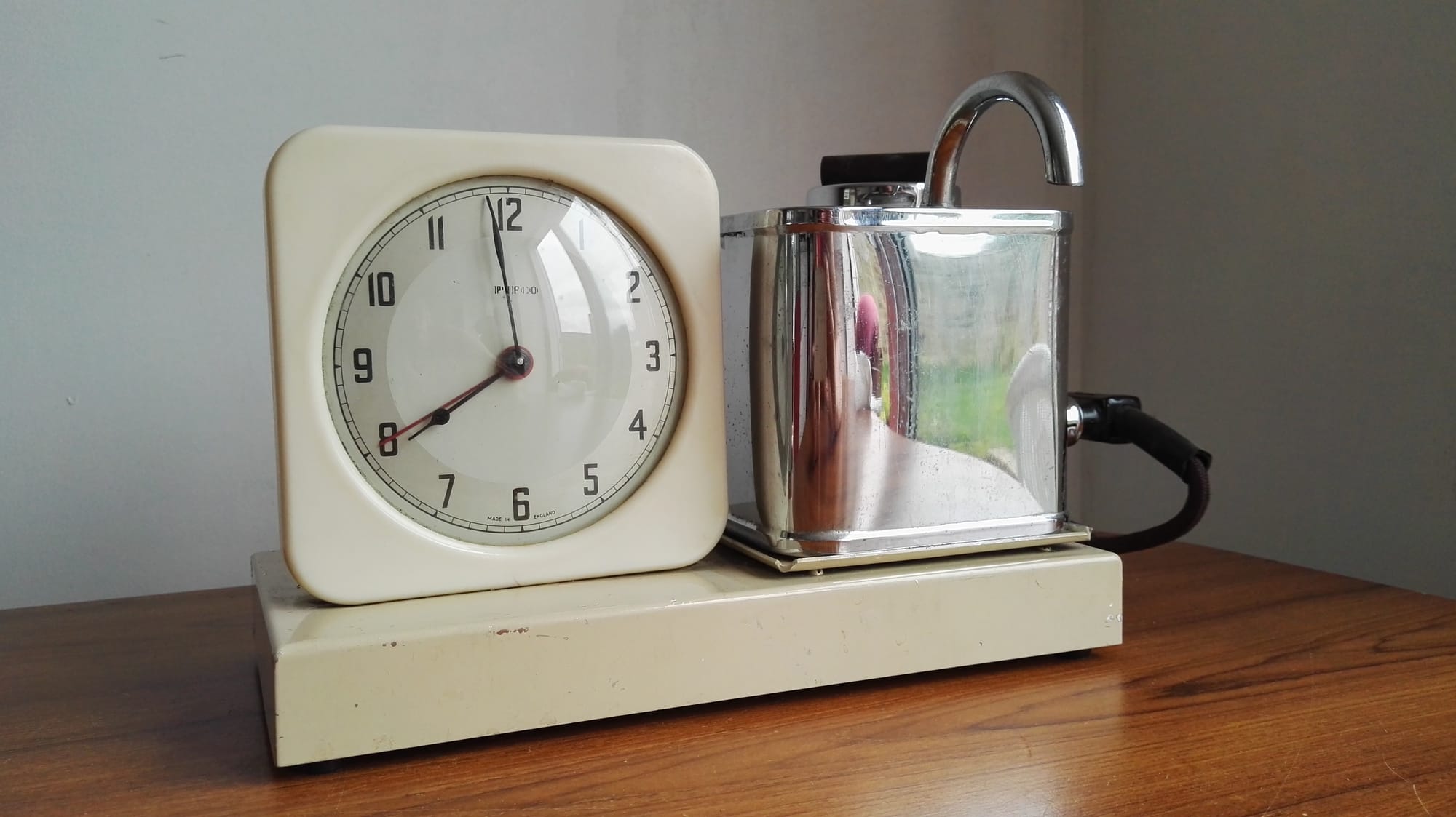Set the clock and the Pifco Tea-O-Matic, without any attention – Boils the water, brews the tea, and wakens you at the appointed time with with a gentle alarm signal. A handsome appliance comprising electric alarm clock in ivory plastic mounted on ivory enamelled base 10 5/8 in. x 5 1/8 in. and chrome plated 2-pint kettle in modern styling. (Teapot not supplied). Table lamp or radio may be plugged ino the 2-pin 5 amp socket mounted on the platform. Complete with 4 feet 3-core braided circular flex. Loading 560 watts.