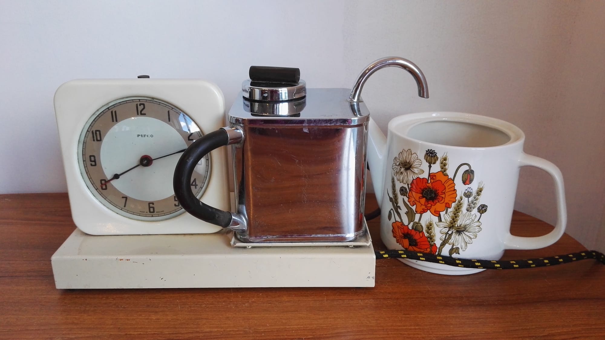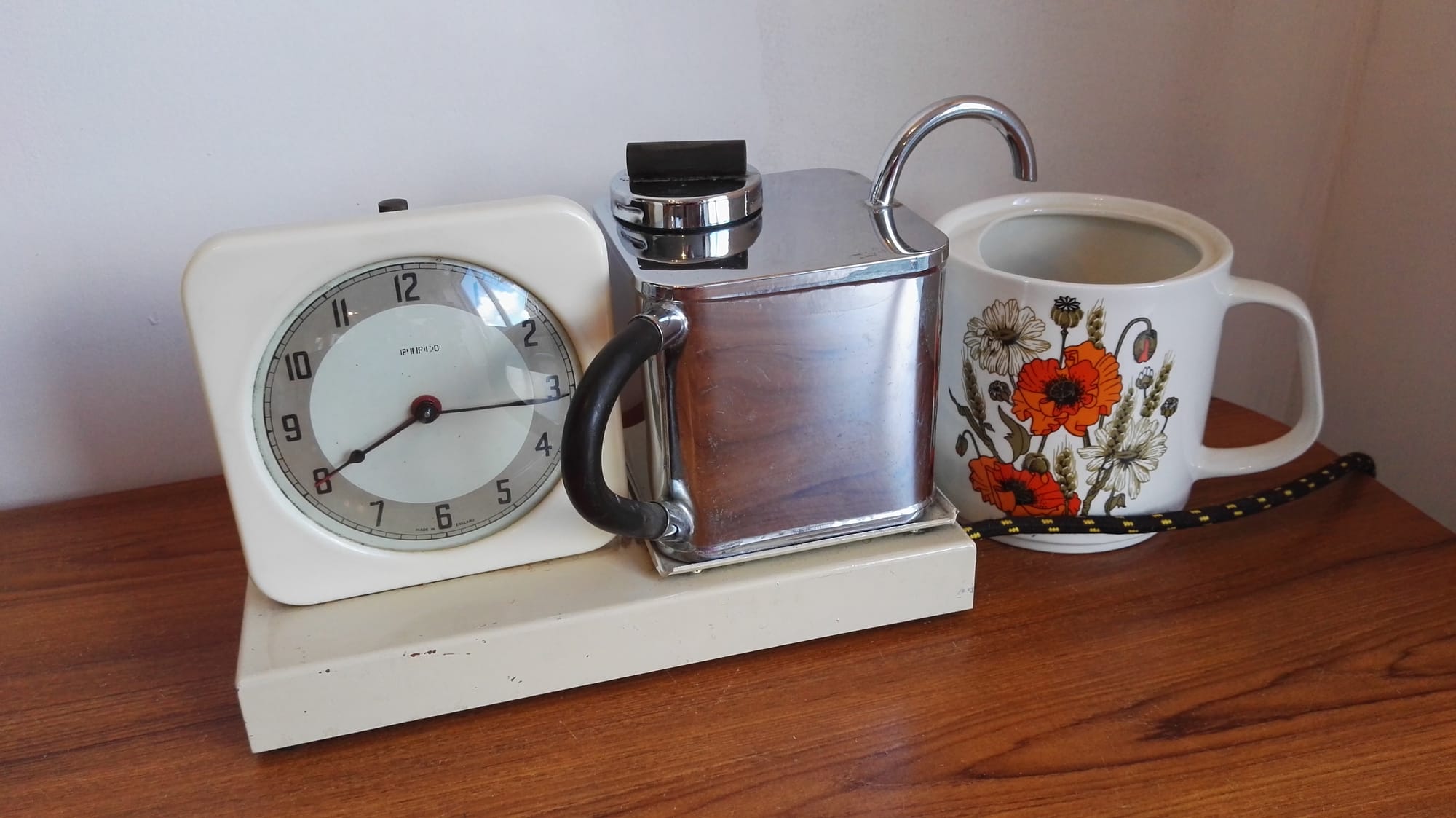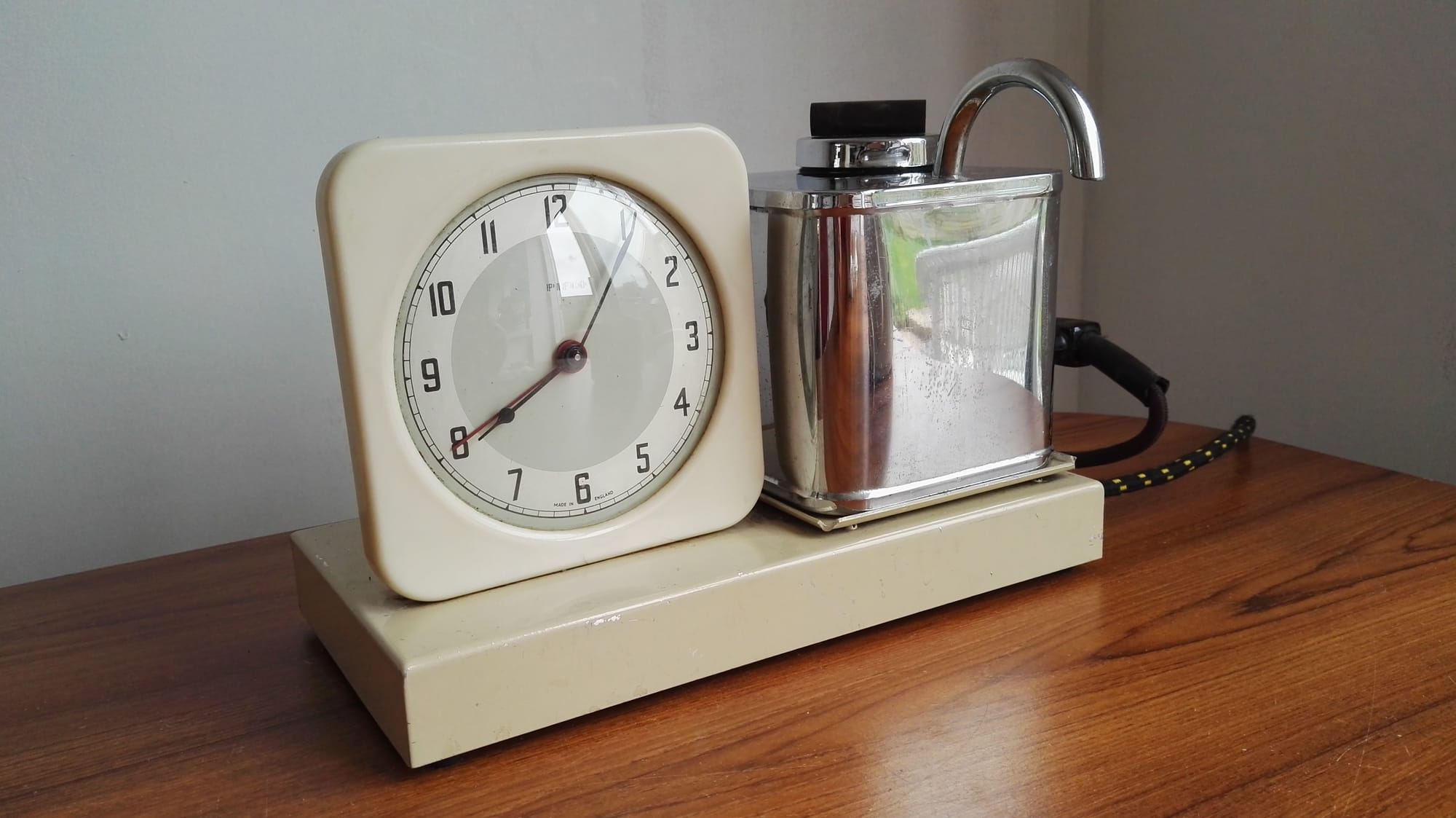 “10” x 5″ folded and painted metal base, hardboard underside with four retaining screws through rubber feet. Chrome kettle on sprung hinged base with switch to provide boil dry cut off. Clock mounted alongside to occupy other half of plinth. Round clock face mounted in square plastic surround. Motor body in black plastic supported at rear by additional “A” bracket for extra rigidity. Clock by Metamac Electric has five controls comprising, alarm cut off, alarm set, sync.start, hands set and “tick” on/off. (Highly sophisticated). Internal wiring and switching is crude and to pre- war standard. Manufacturer plate on rear of plinth. Kettle with neolite handles has blade type heating element. Kettle discharges into operator provided tea pot (need to ensure adequate capacity!) with quiet and rapid discharge by normal standards.