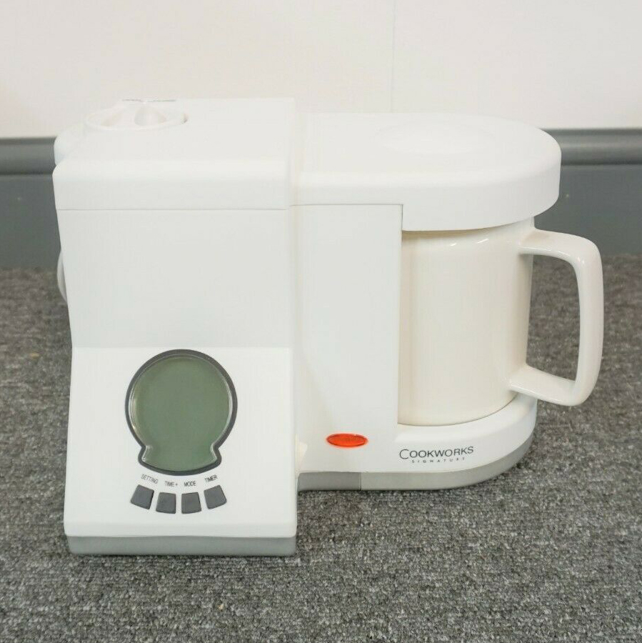 The Argos Cookworks Signature tea maker was introduced in 2008. It makes up to 4 cups of tea, with auto tea making and tea now facilities. There is an illuminated LCD clock with an analogue face and a power indicator.