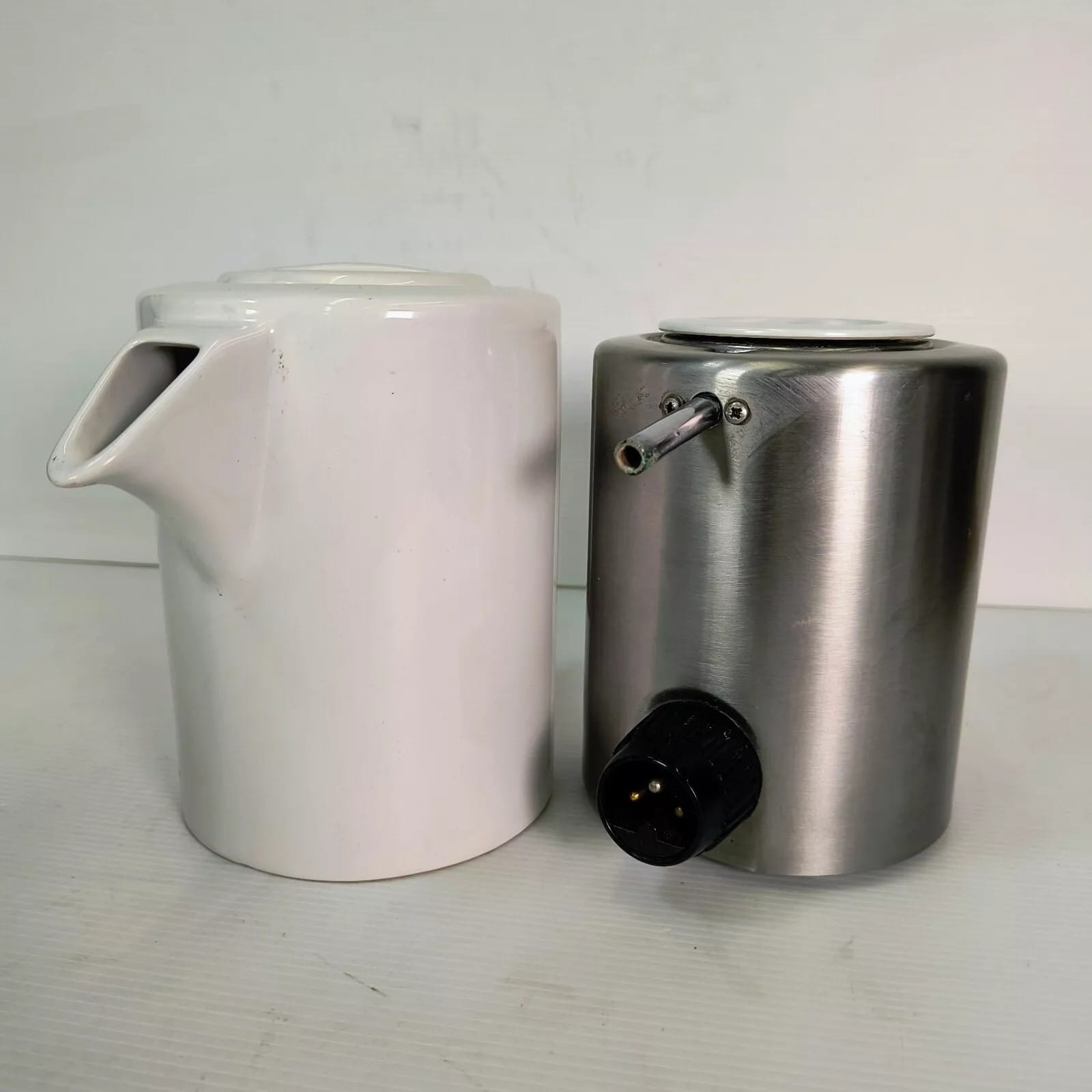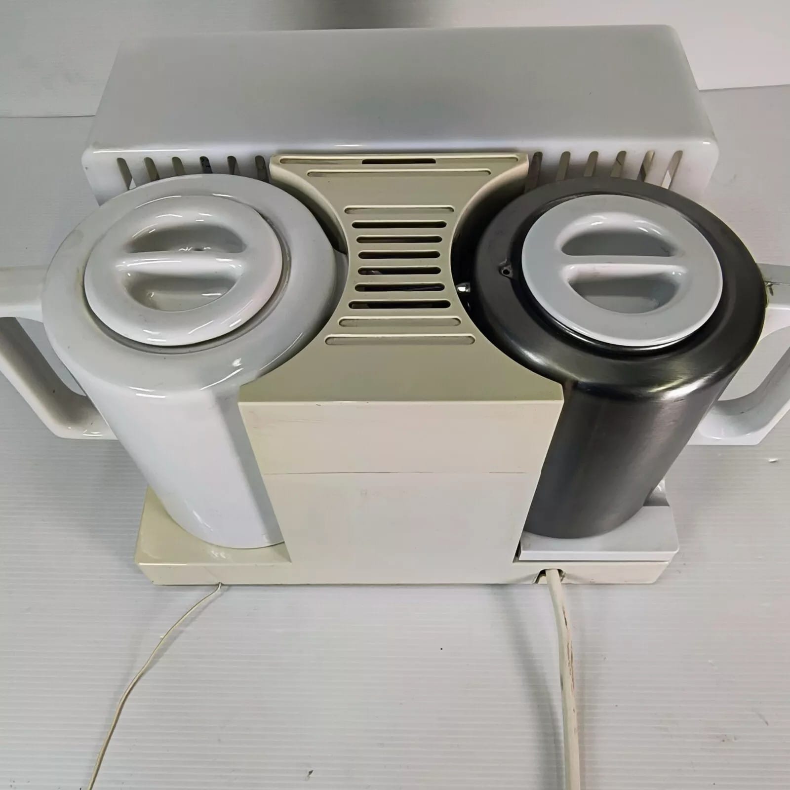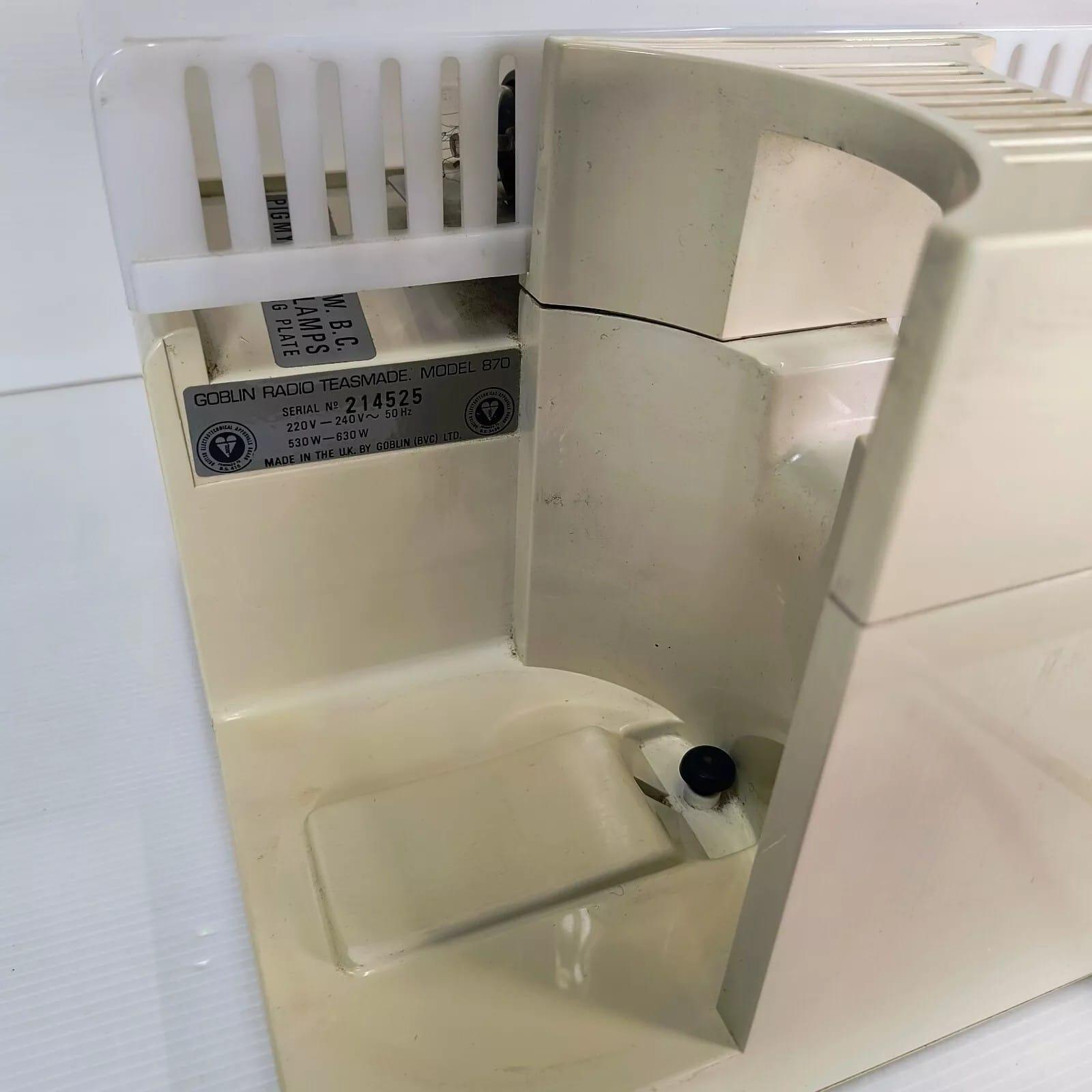In about 1979 Goblin brought out a Radio version of the 870 teasmade. It was the first teasmade to feature a radio. A proposal for the radio teasmade 870 was drafted in March 1977. Grundig were selected to supply the radios. but not informed of reason for initial purchase. On our photograph the wire radio aerial is visible to the right. There is also a speaker grille and an auxiliary earphone plug.
