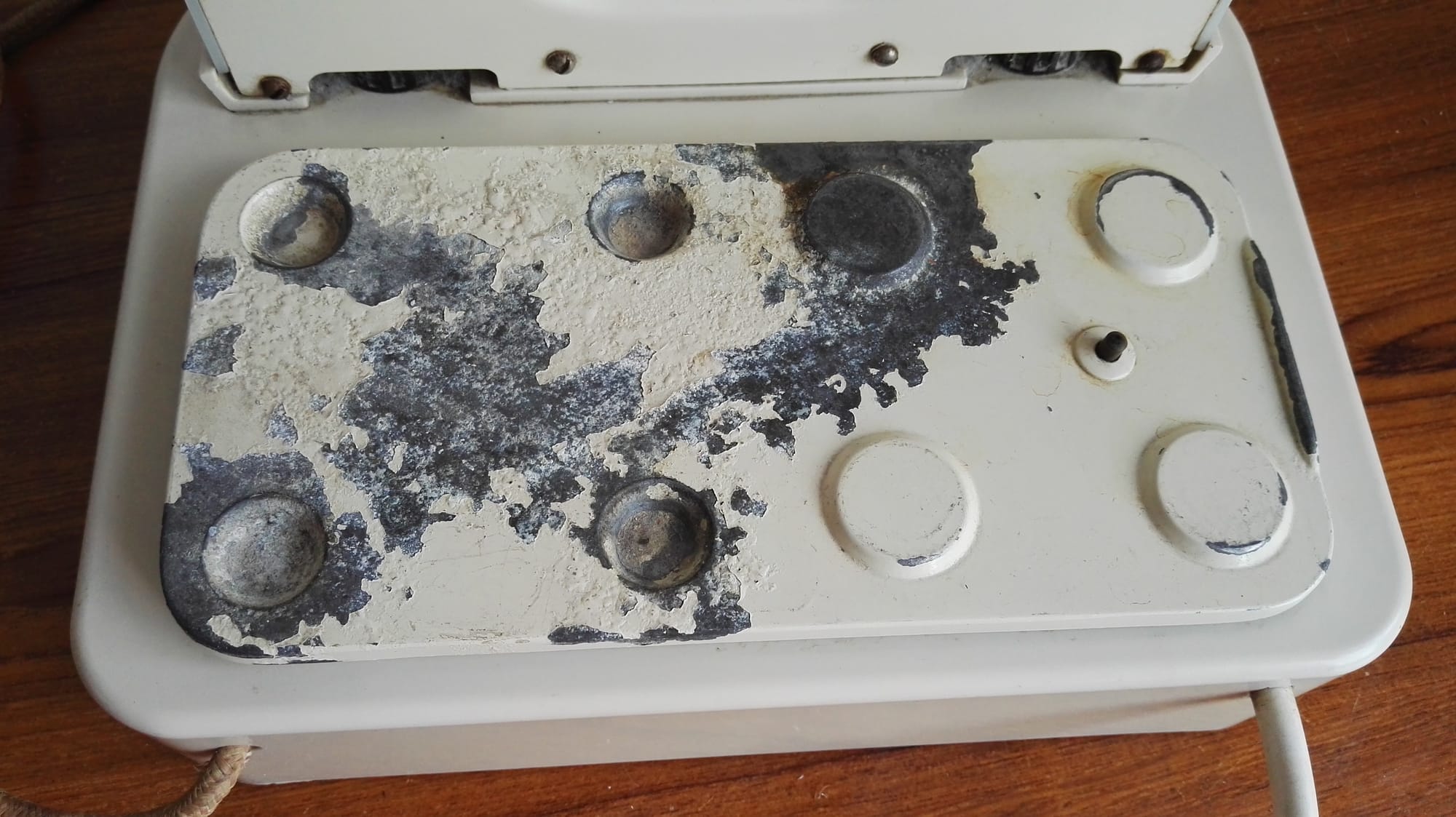 "One weekend in 2002 I went to a boot fair (every Sunday on 6 floors of a multi - storey car park) and spotted a Goblin teapot and old box. On looking inside it was a D25b, complete but very shabby. The asking price was £5 but reduced to £4 due to broken teapot spout (it still pours). I snapped it up at once. I think it was unused for many years and stored in a shed. It was dirty and damp, the insides had cobwebs & dead insects etc. The leads had been gnawed. However a good clean up and sympathetic rewire using cloth covered flex from an old iron and it's back to its former glory. Kettle descaled and teapot bleached - time to plug in.