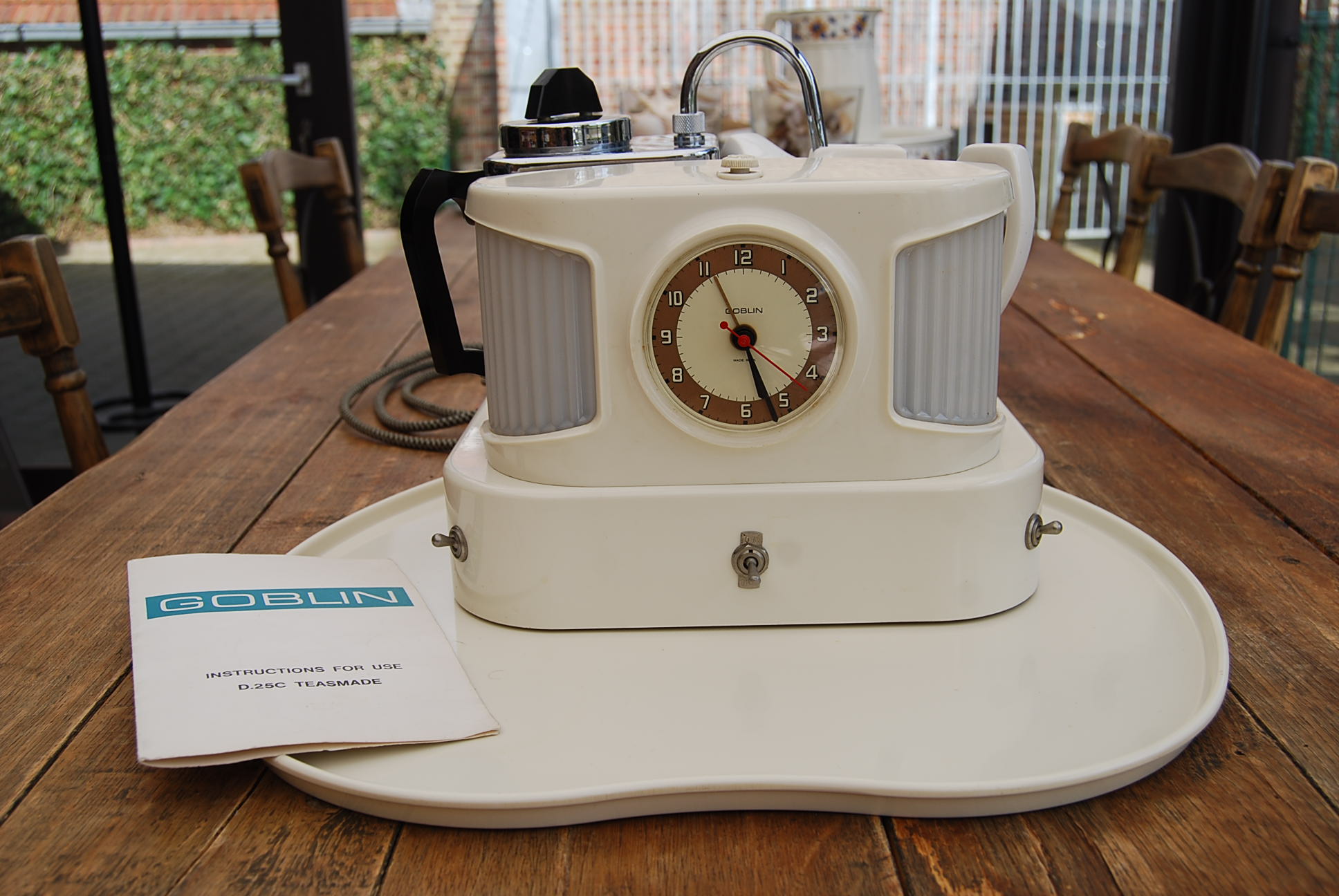 The Goblin Teasmade model D25c was manufactured from 1967. The kettle is similar to the D25b but has ball impressed feet. The platform is reversed from the previous model: the kettle on the left and the teapot on the right. This style and arrangement of teapot right and kettle left remained standard from this point onwards. The socket and plug, now on the other side, has a circular 3 pin internal earth.