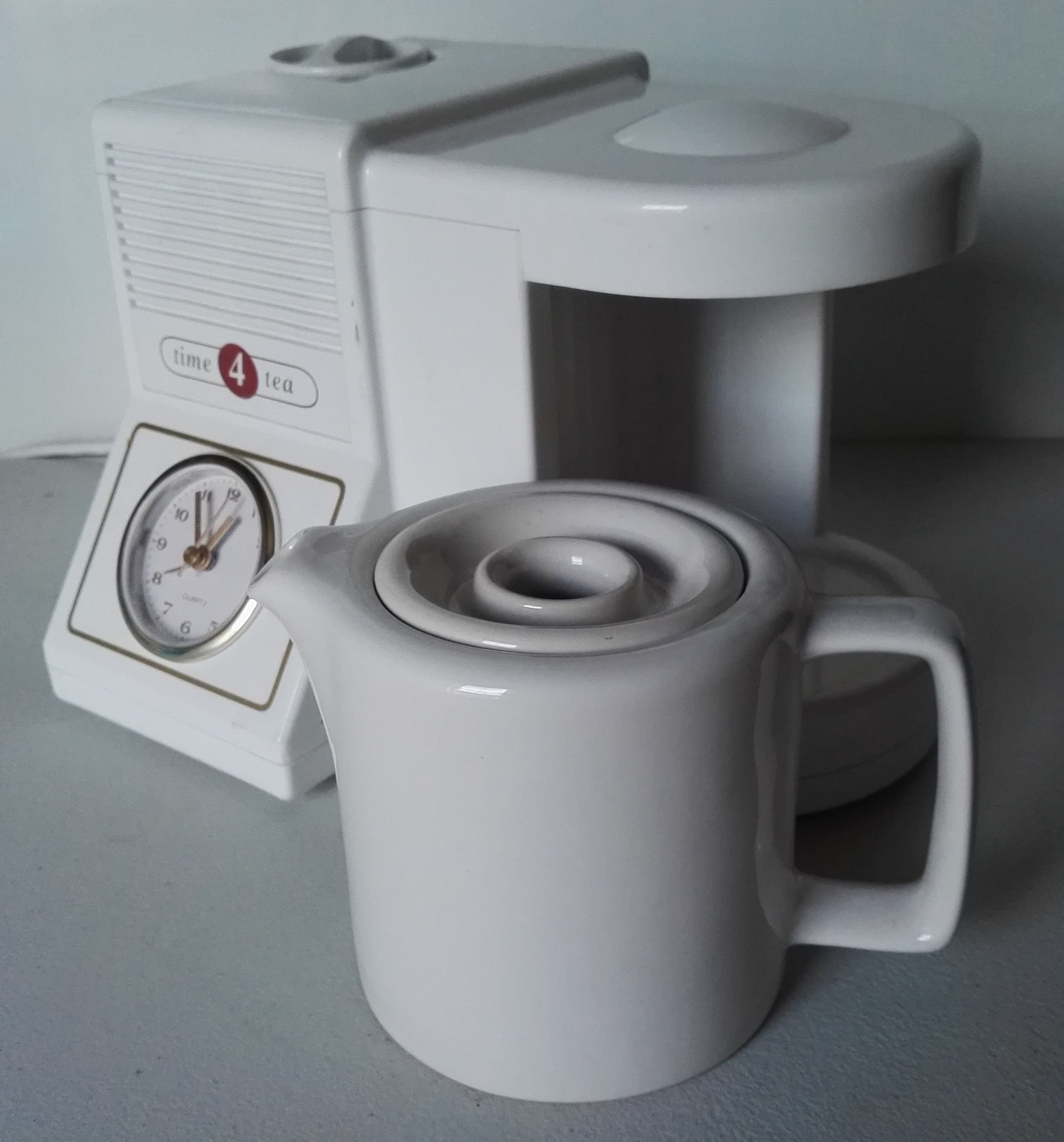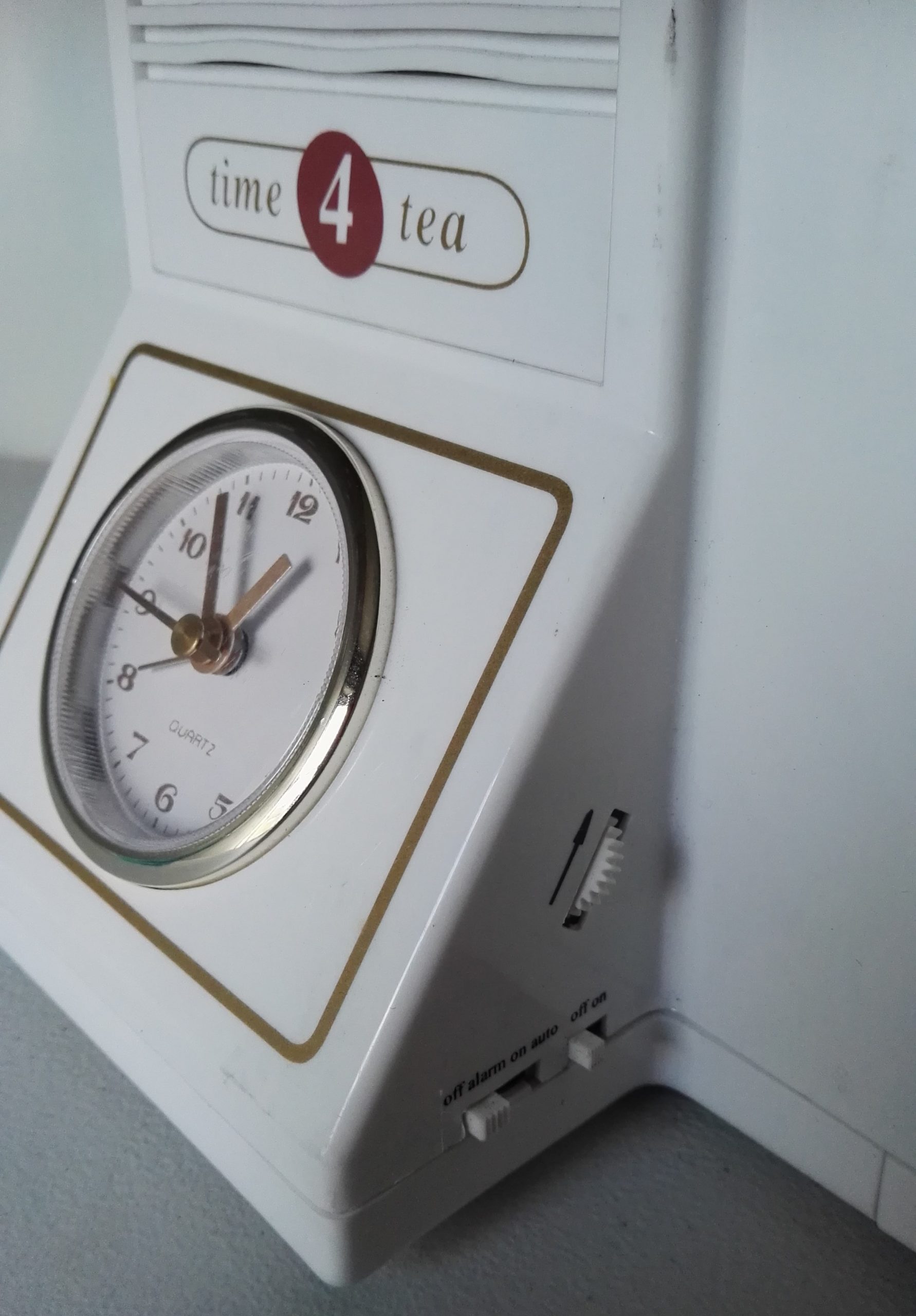 This handy appliance combines a tea-maker with an alarm clock, which has an illuminated face, and comes complete with a stylish ceramic tea pot which can hold up to four cups, hence the name Time 4 Tea. It gives users the convenience of waking up to a morning cup of tea without having to get out of bed. The Time 4 Tea has an attractive design, combining classic white with stylish gold trim.