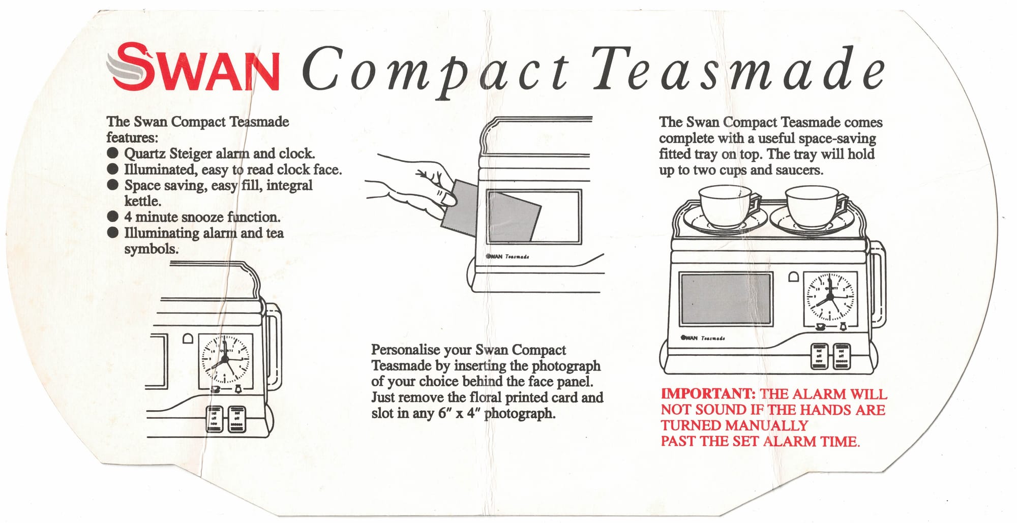 2000 edition of the instruction manual for the use of the Swan Compact D01-P1 Teasmade, free to download.