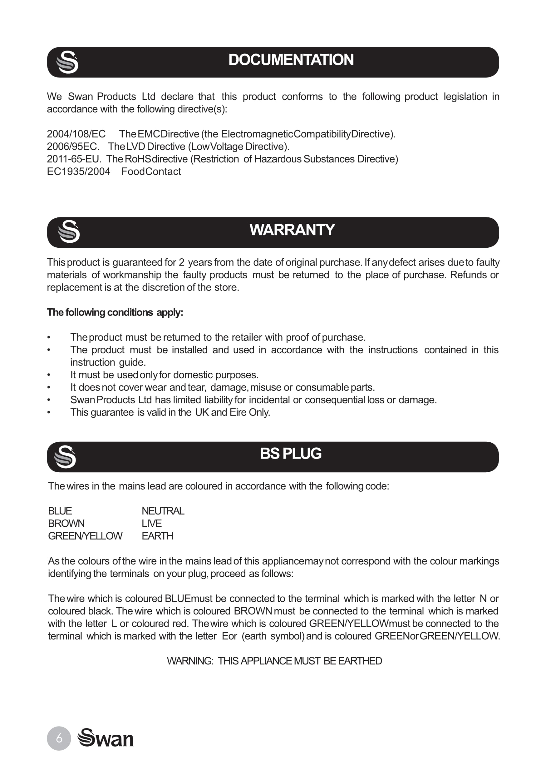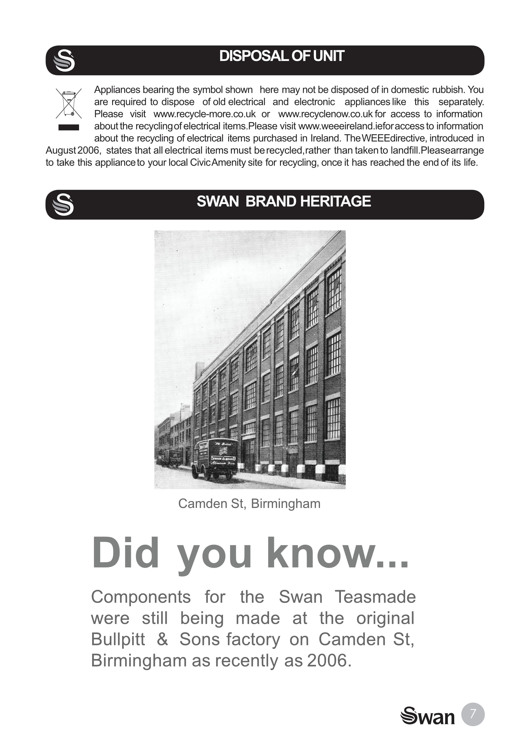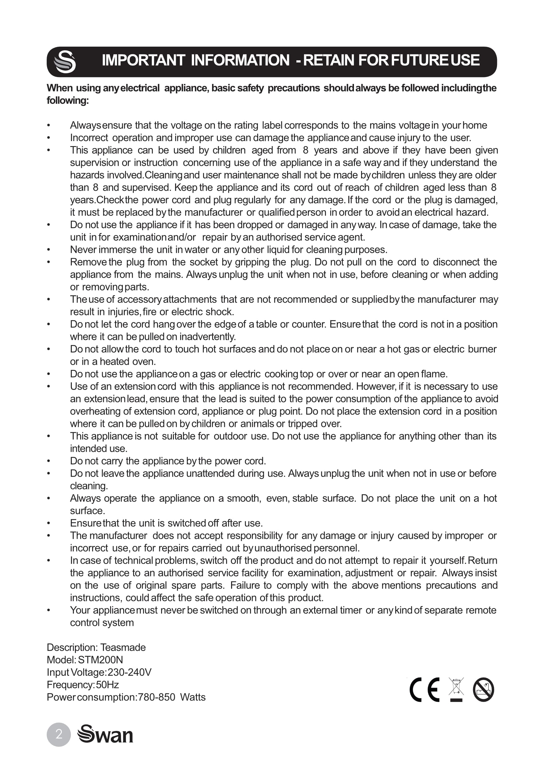 Here are the eight individual pages from the original v1.5 pdf edition of the Swan Teasmade STM200N instruction manual. There was also a paper version within the box. The pages are free to download.
