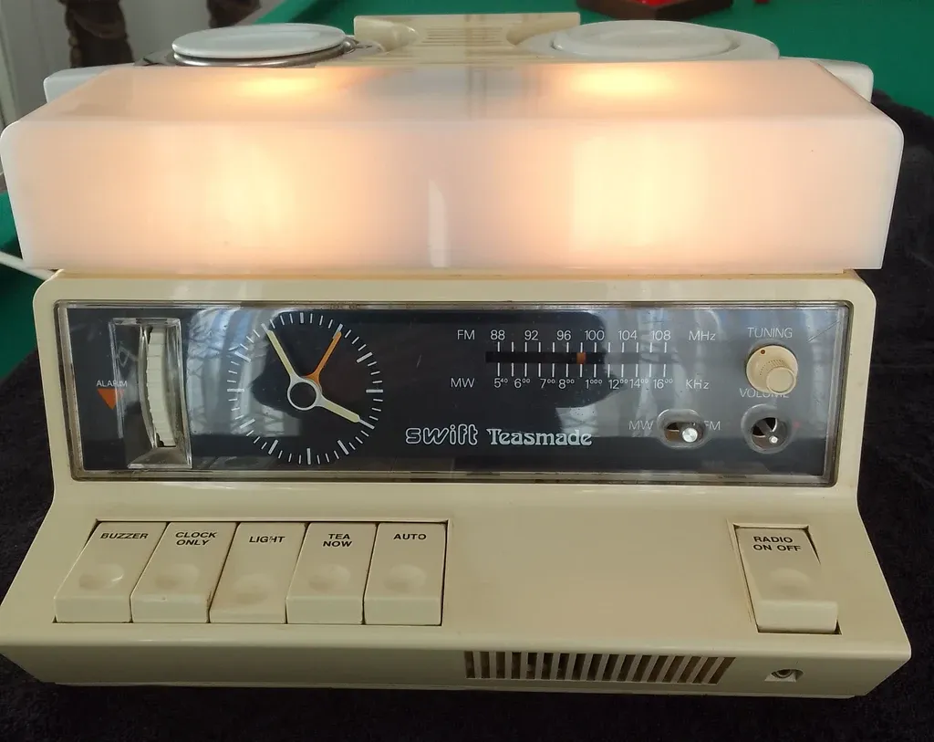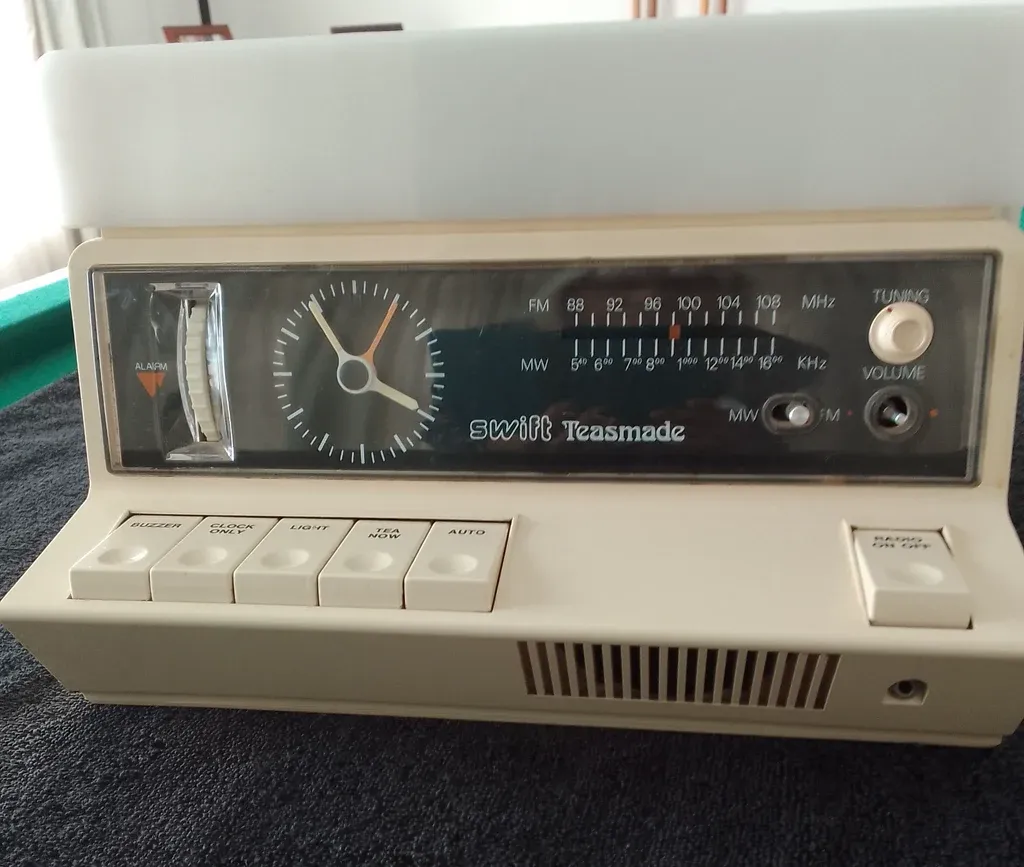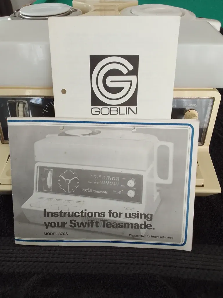 There were several versions of Goblin teasmades, branded Swift, which were exported to South Africa. To date I have spotted Swift versions of the 854 (presumably the 854S) and the 870 Radio Teasmade.